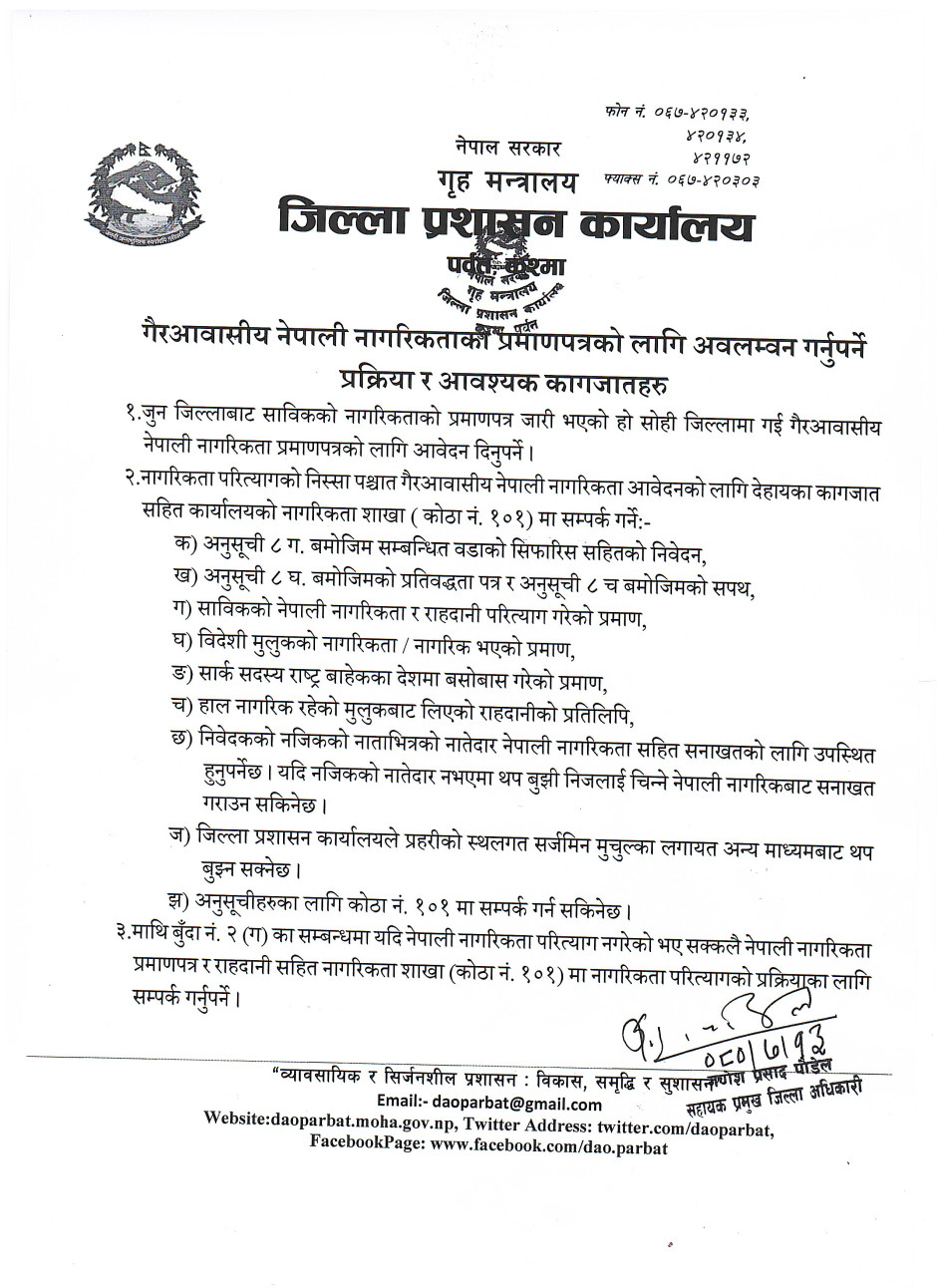 गैर आवासिय नेपाली नागरिकताको प्रमाणपत्रको लागि अवलम्बन गर्नुपर्ने प्रक्रिया र आवश्यक कागजातहरु