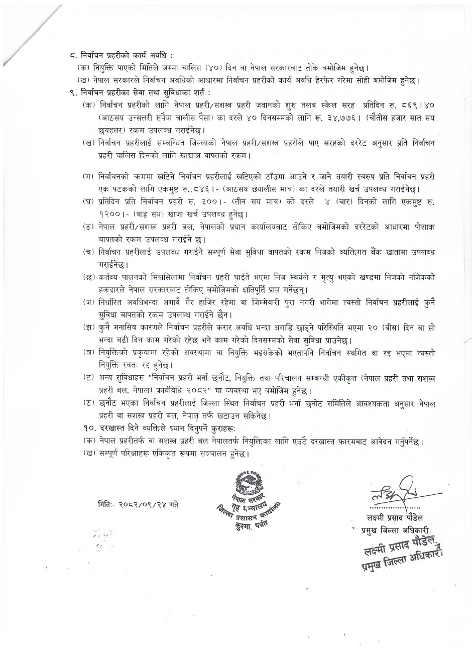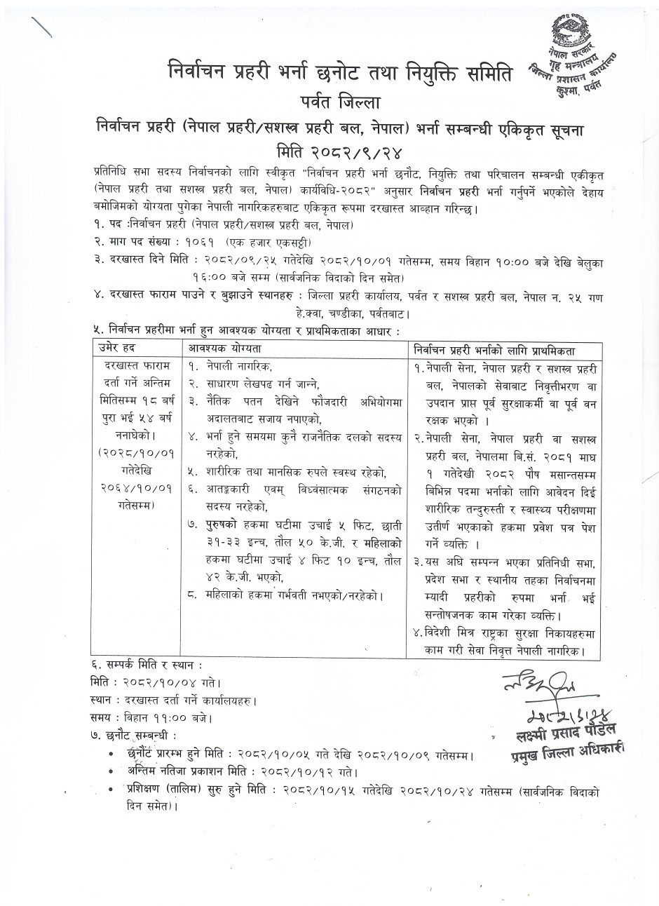 निर्वाचन प्रहरी भर्ना छनोट तथा नियुक्ति समिति पर्वतको निर्वाचन प्रहरी ( नेपाल प्रहरी/ सशस्त्र प्रहरी बल, नेपाल) भर्ना सम्बन्धी एकिकृत सूचना